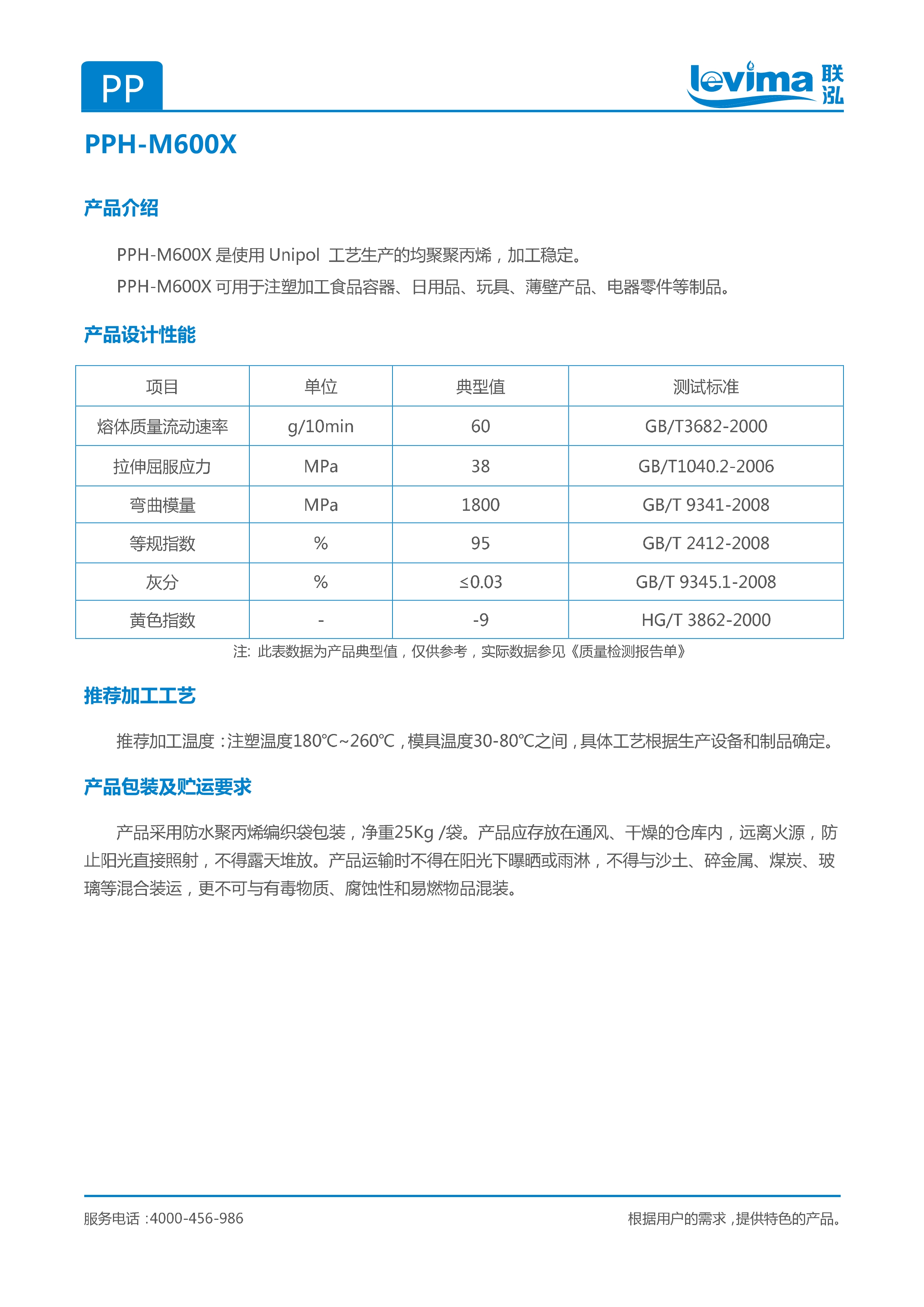 It belongs to homo-polypropylene with high melting point. It can be applied to plastic moulding and processing of food containers (disposable meal box), daily necessities, toys, thin film products, electric parts, automobile ornaments, and etc.