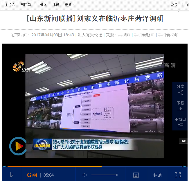 2017年4月7日,春和景明,山東省委書記劉家義蒞臨聯泓新材料有限公司視察。山東省委常委、秘書長于曉明、棗莊市市委書記李同道、市長李峰、棗莊市委常委秘書長朱國偉、滕州市市委書記邵士官、市長劉文強、聯泓集團董事長鄭月明等陪同視察。