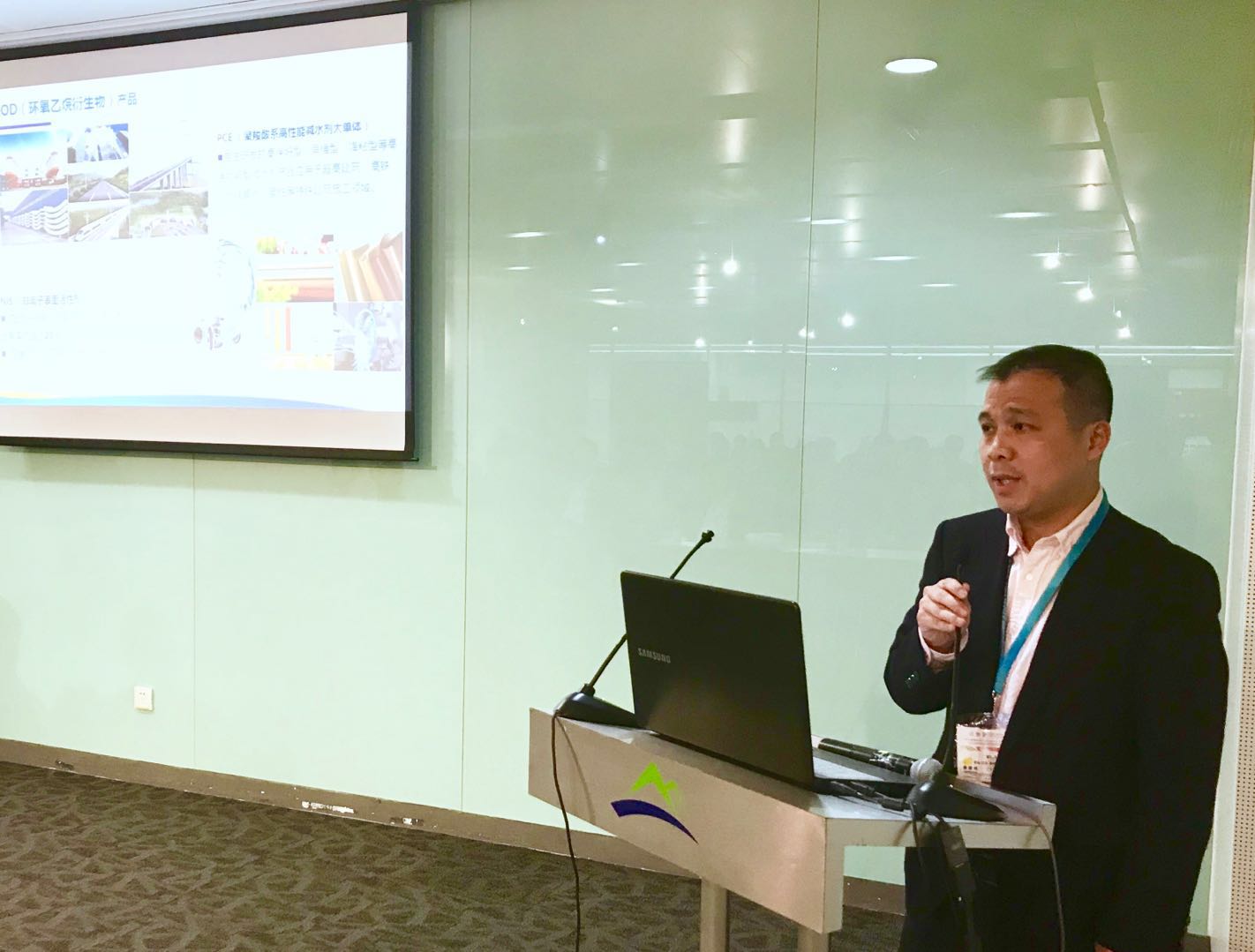 在同期舉辦的印染助劑行業信息交流會上,聯泓研究院研發經理曾紅舟作了題為《新型環保高效表面活性劑在印染助劑中的應用》的主題報告,并對聯泓新材料的企業概況、研發理念及特色產品做了宣講。