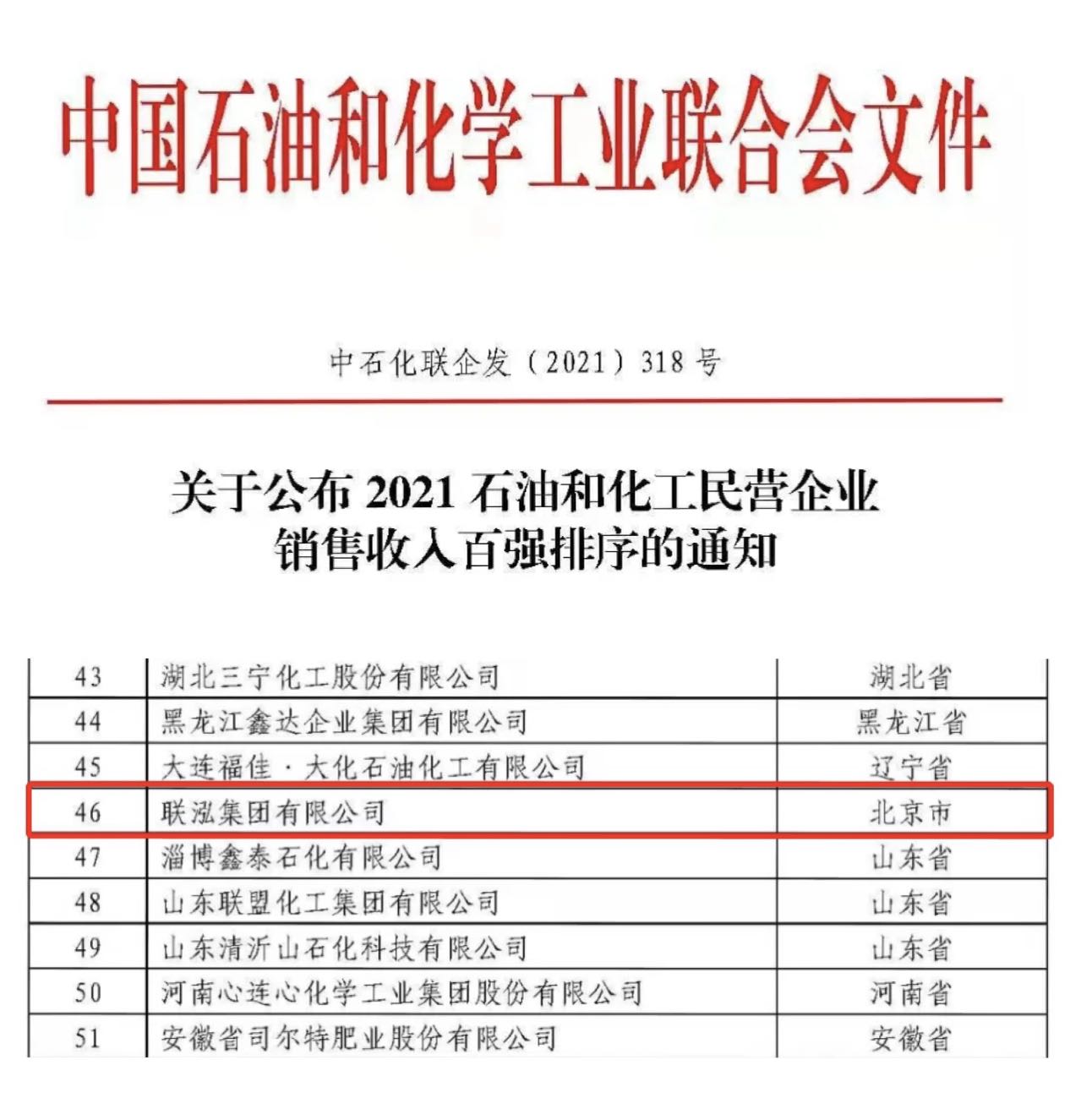 12月28日,中國石油和化學工業聯合會發布了2021中國石油和化工民營企業銷售收入百強榜單。聯泓集團有限公司位列第46位。