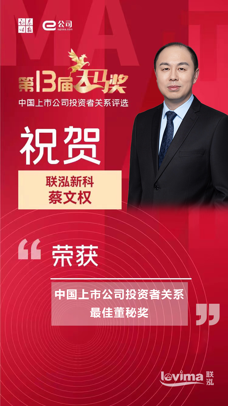 e公司訊 4月22日,“穩中求進?篤定前行”證券時報第十三屆中國上市投資者關系天馬獎評選榜單隆重揭曉,聯泓新科(003022)董秘蔡文權在本屆活動中,榮獲中國上市公司投資者關系最佳董秘獎。