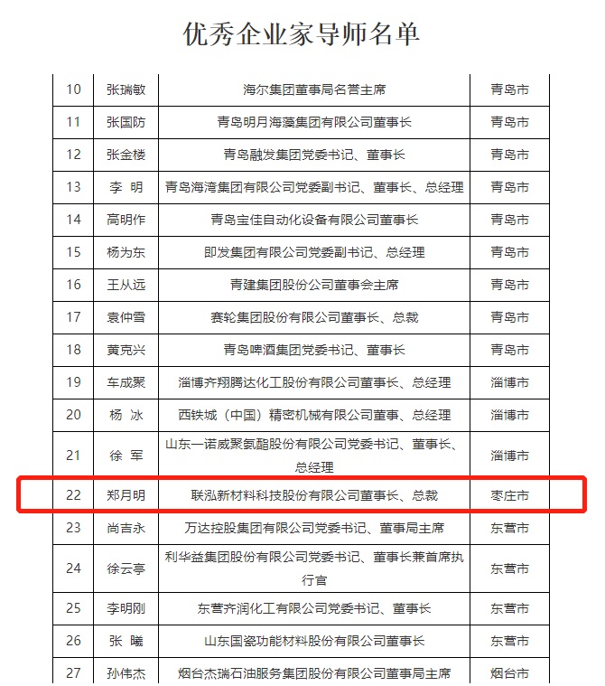 5月16日,山東省工信廳發布《關于建立青年企業家培養導師制的通知》。從今年起,山東將建立青年企業家培養導師制,邀請2021年山東省委、省政府表彰的部分優秀企業家擔任導師,依托導師所在企業建立“青年企業家培育中心”,發揮優秀企業家傳幫帶和產業引領作用,培養青年企業家。聯泓新科董事長鄭月明受邀擔任“優秀企業家導師”。
