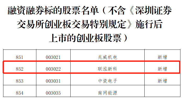 2022年10月21日,深圳證券交易所發布《關于擴大融資融券標的股票范圍的通知》,聯泓新科(SZ. 003022)入選融資融券標的股票。本次調整將于2022年10月24日起實施。