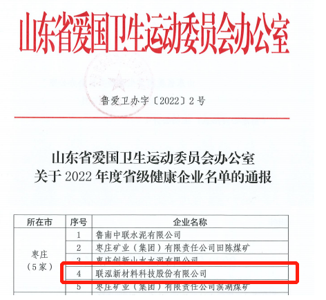 12月19日,山東省愛國衛生運動委員會辦公室通報2022年度省級健康企業名單,聯泓新材料獲評“2022年度省級健康企業”。