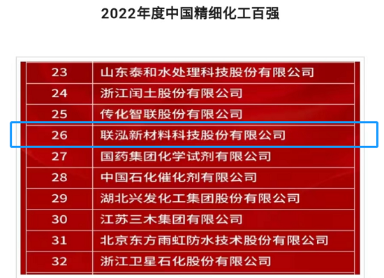 1月11日,第二十二屆全國精細化工原料及中間體行業峰會暨2022中國精細化工百強發布會在江蘇無錫舉行。會上發布了“2022年度中國精細化工百強”榜單,聯泓新材料位列第26位。