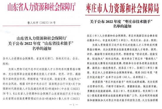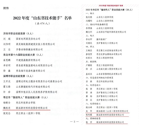 近日,山東省人力資源和社會保障廳、棗莊市人力資源和社會保障局分別公布了2022年度“山東省技術能手”名單、2022年度“棗莊市技術能手”名單。憑借在2022年棗莊市“魯班傳人”職業技能大賽的突出表現,聯泓新材料檢驗檢測中心魏秋連被授予2022年度“山東省技術能手”榮譽稱號,檢驗檢測中心龍華、程利霞、張芳3名員工被授予2022年度“棗莊市技術能手”榮譽稱號。