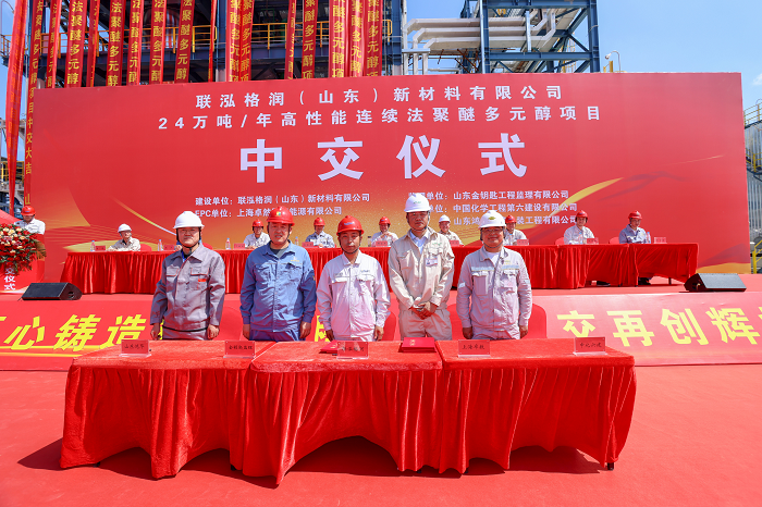 聯泓格潤一體化項目是山東省重大項目,包括MTO、EVA、PO、PPC、PPG、公用工程等裝置。經過團隊一年多的全力拼搏,項目公用工程相關系統單元已分批次陸續中交,凈水廠已投運,總變一次送電成功。此次建成中交的PPG裝置是項目首套中交的生產裝置,是團隊不懈努力和項目按節點達成目標的重要體現。