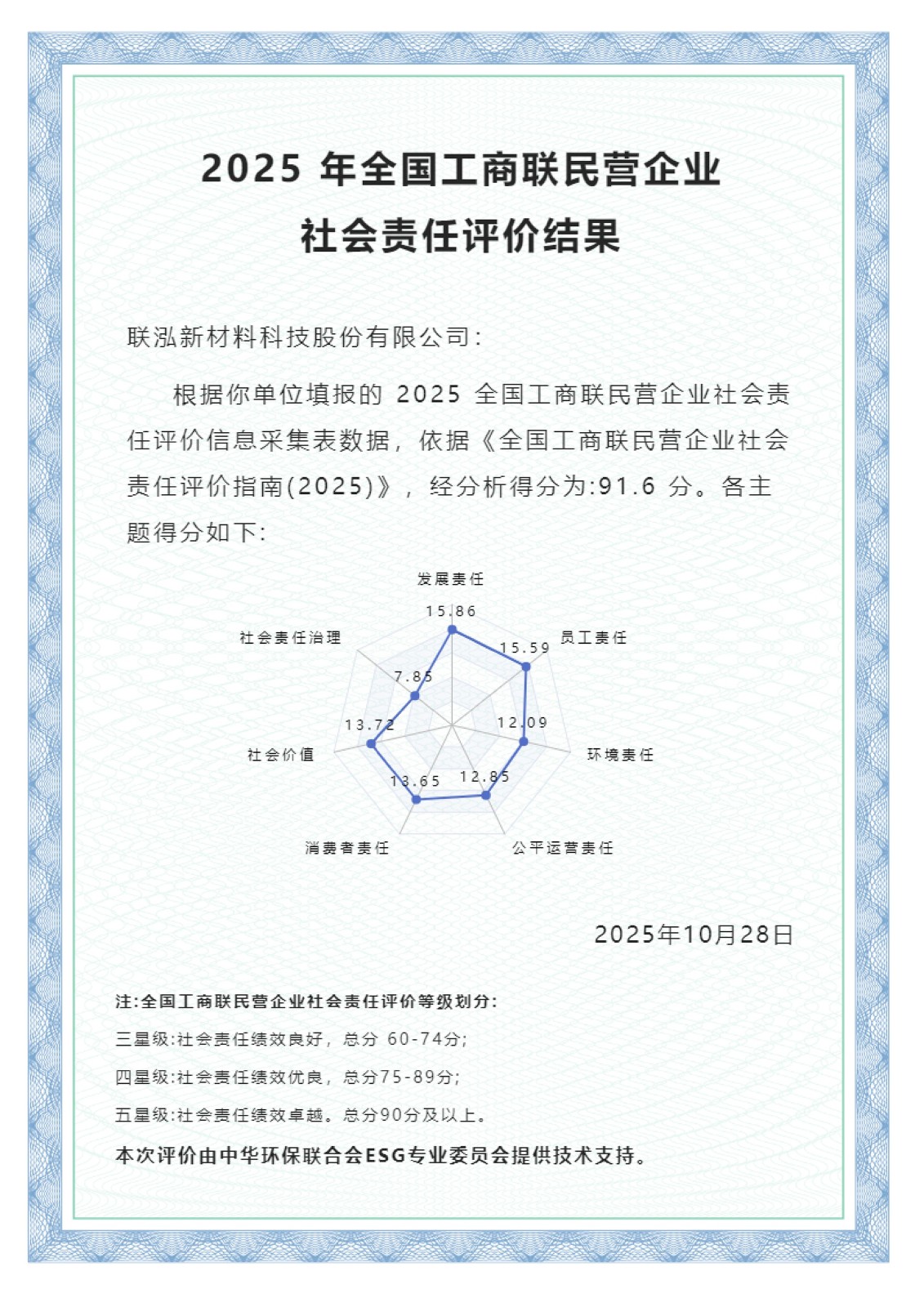 聯泓新科獲全國工商聯民營企業社會責任評價最高等級“五星級”