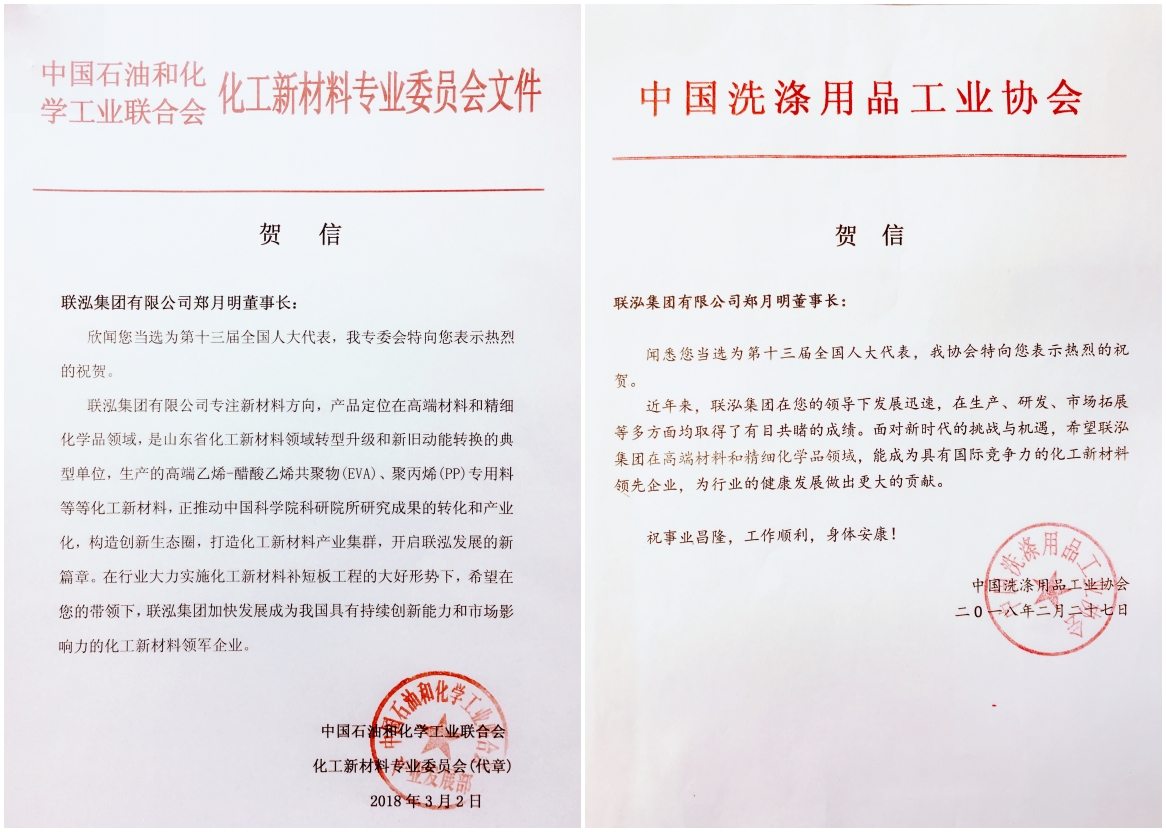 2018年1月31日,在剛剛結束的山東省十三屆人大一次會議上,聯泓新材料董事長兼CEO鄭月明當選第十三屆全國人大代表。