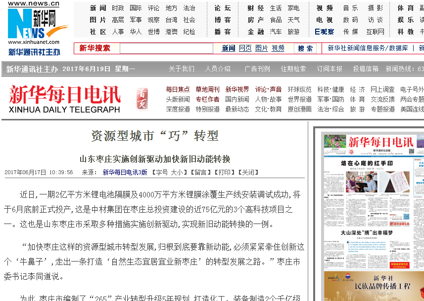 新華網《資源型城市“巧”轉型 山東棗莊實施創新驅動加快新舊動能轉換》